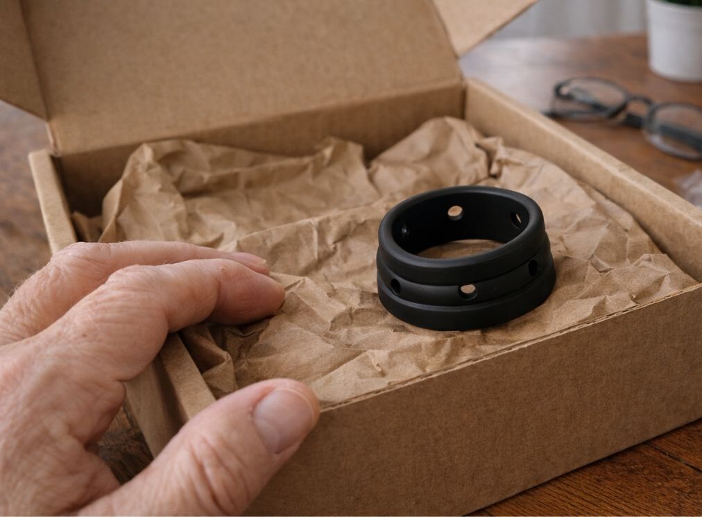 The device consists of a microchip encapsulated in Grade VI Hypoallergenic Surgical Silicone — the same material used in cardiac valves and stents. It is positioned on the glans penis for 5 minutes before intercourse.
