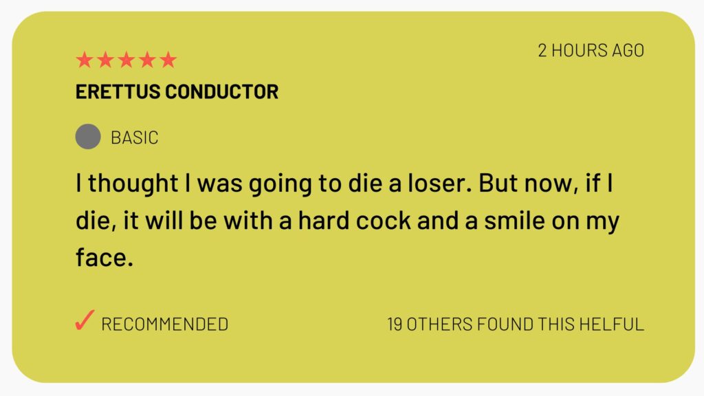 OR are you going to do the right thing… order one, two or three Erettus Conductor™ and spend the next few days working on your recovery from erectile dysfunction?